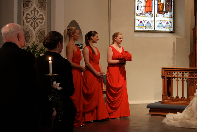 Pictures from the beautiful wedding that took place in Helsinki on saturday. To be honest I did not know which side to take in church because the groom was a relative, but I was more involved with preparations from the bride's side. I designed the red bridesmaid dresses, but was a little nervous about the turnout because I did not have a chance to see the finished dresses live until the bridesmaids walked down the aisle... Luckily all three looked gorgeous. I might also had a little something to do with getting that amazing Vera Wang 'Diana' dress (and matching VW invitations) over to Finland...